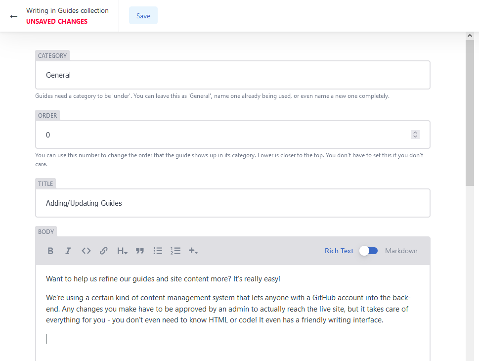 We’re using a certain kind of content management system that lets anyone with a GitHub account into the back-end. Any changes you make have to be approved by an admin to actually reach the live site, but you’re able to add or edit pretty much anything on the site. The admin panel it takes care of everything for you - you don’t even need to know HTML or code! It even has a friendly writing interface.